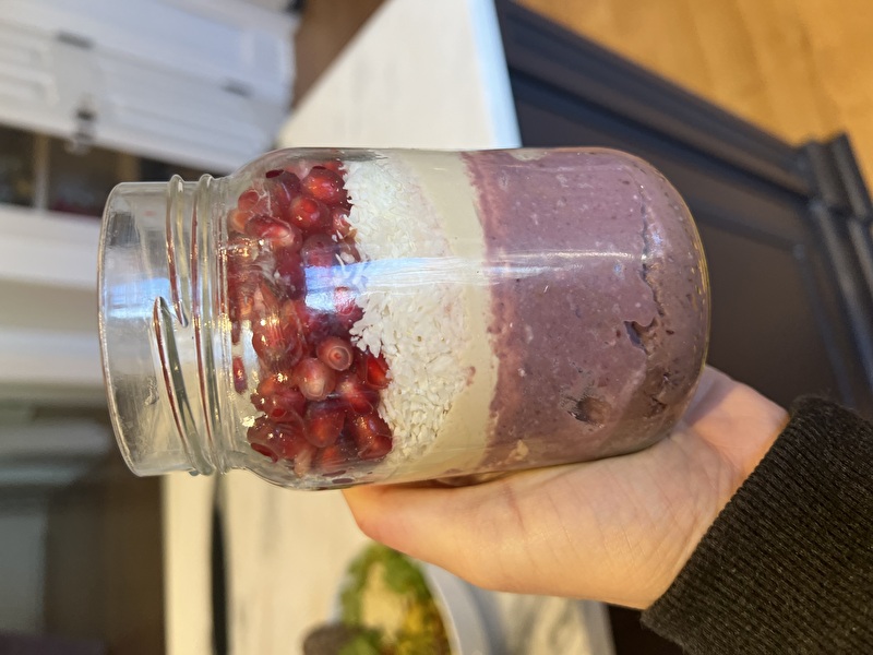 *Blend up all of the above ingredients!  Layer with yogurt of choice (I mix my sheep's milk yogurt up with vanilla protein powder for extra protein), coconut flakes and pomegranate seeds!