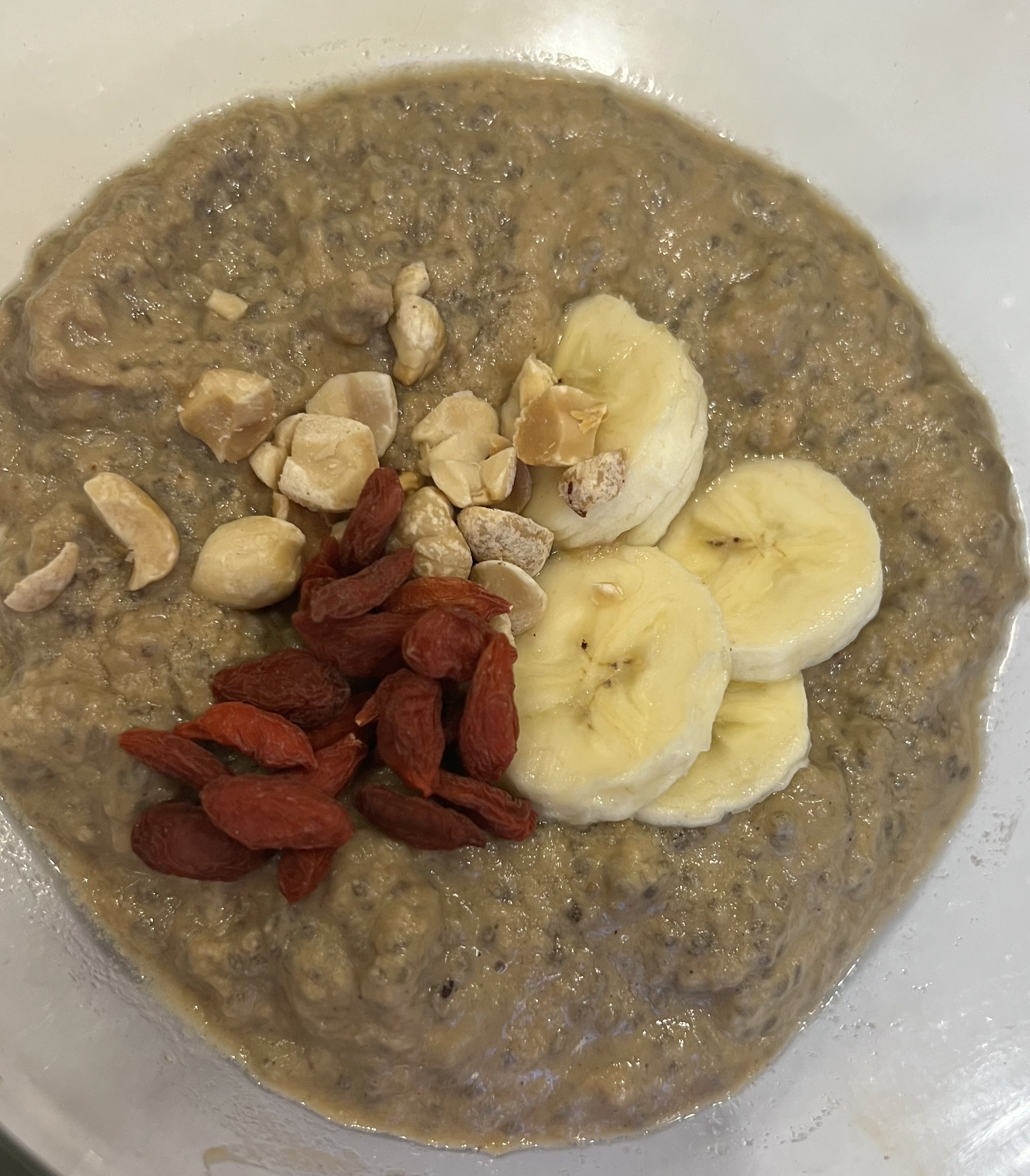 Blend together the protein powder, banana and almond malk.  Mix in 2 tablespoons of chia seeds and warm in a pot on the stove.  Top with crushed peanuts, banana and chopped peanuts.  Enjoy!